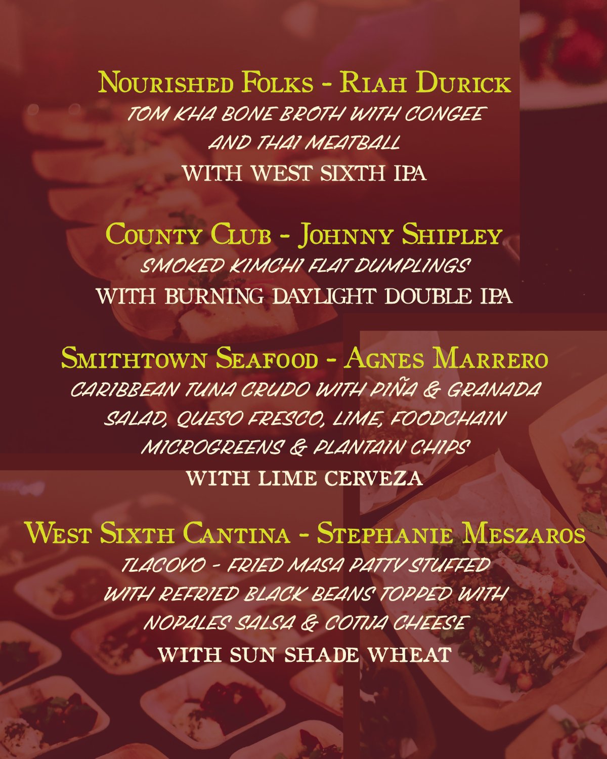 You got here at 5:30 to be among the first folks in the door at 6, excited for an evening when top local chefs and West Sixth Brewing come together for an incredible night of small plates and craft beer. The event officially begins at 6:00 p.m., with chefs and beer experts serving up their creative pairings at stations throughout the brewery. Food service runs until 8:30 p.m., giving you plenty of time to sample everything and chat with friends. After 8:30, the main taproom stays open for regular pours and a relaxed hangout as the party winds down. Chances are, you’ll probably be one of the last lingerers, soaking up the atmosphere until closing.